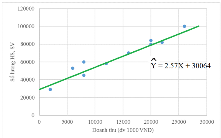 Ví dụ tiếp theo giả sử công ty muốn mở một cửa hàng mới trong khu vực ngoại ô và nơi này có số lượng học sinh, sinh viên là 20000, công ty muốn dự báo doanh thu của chính cửa hàng này trong tương lại. Chúng ta cùng thiết lập khoản dự báo với y^ = 81464 – giá trị dự báo dựa vào phương trình hồi quy.