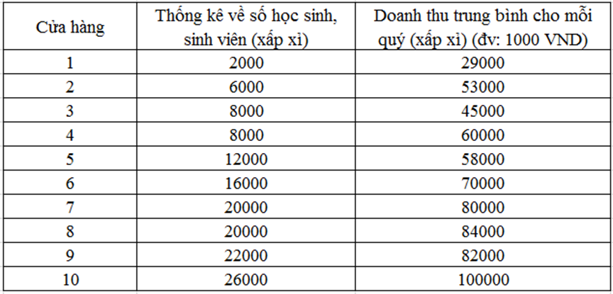 Giả sử chúng ta ước lượng giá trị trung bình doanh thu 10 cửa hàng khi số học sinh, sinh viên trong khu vực là 20000, với độ tin cậy 95%, mức ý nghĩa α = 5%, tra bảng t bậc tự do n – 2