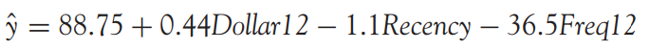 Giả sử sau khi xem xét chúng ta xác định được 3 biến độc lập X quan trọng cần đưa vào là Recency, Frequency12 và Dollar12. Như đã nói ở phía trên và bài viết trước, khi xây dựng mô hình hồi quy đa biến, chúng ta phải sử dụng các công thức ma trận để tính toán các hệ số hồi quy và khá cồng kềnh. Các phần mềm thống kê, phân tích dữ liệu hiện nay đều cho phép chúng ta tìm các hệ số hồi quy nhanh chóng và lập phương trình hồi quy đa biến dùng để ước lượng và dự báo giá trị biến mục tiêu: