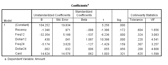 Nhìn lên kết quả có thể thấy ngay các cặp biến Freq12, Freq24, và Dollar12, Dollar 24 đều có hệ số VIF > 2, đặc biệt trừ Card là biến Dummy, các biến còn lại đều là biến định lượng, nên kết quả này khẳng định mô hình chắc chắn bị đa cộng tuyến nếu đưa tất cả các biến vô để phân tích, tương tự hệ số tolerance đều < 0.5 (1/VIF = 1/2 = 0.5). Nếu chưa xây dựng mô hình thì chúng ta phải loại bỏ một trong mỗi cặp biến.