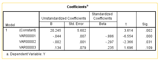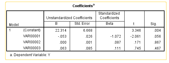 Giả sử chúng ta có mô hình hồi quy với 1 biến mục tiêu y và 3 biến độc lập x, bên trên là kết quả bình thường, giữa các biến x không có mối quan hệ tương quan, tức không có đa cộng tuyến, nhìn vào phần Correlations, trị tuyệt đối hệ số tương quan giữa các biến không quá gần 1 hay -1. Các biến thứ var00001 và var00002 có hệ số tương quan âm với biến Y, và hệ số hồi quy cũng âm (nhìn vào cột B), riêng var00003 có hệ số tương quan âm với biến Y, nhưng hệ số hồi quy dương 0.134, và nhìn vào cột Sig, tức p-value 0.109 > 0.05, tức không bác bỏ H0: B3 = 0. Tức không có ý nghĩa cho mô hình, nên chúng ta có thể sẽ bỏ biến này khỏi mô hình. Nhìn tổng quan thì kết quả trên không có gì đáng nói, chúng khá bình thường