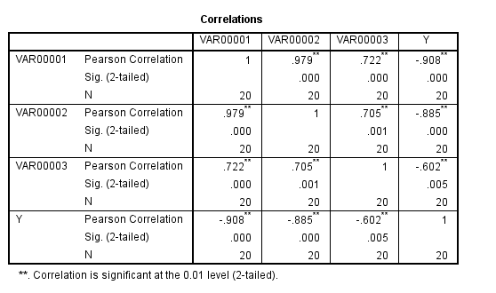 Nếu xét ví dụ khác giả sử biến Var00001, và Var00002 có quan hệ tương quan thuận mạnh, hệ số tương quan gần bằng 1 là 0.979 như dưới đây? Chúng tôi giữ biến Var00001, Var00003, và thay đổi giá trị Var00002 sao cho nó tương quan thuận để tạo ra kết quả so sánh cho các bạn dễ hiểu. Trước tiên các bạn có thể thấy khi bộ dữ liệu thay đổi, ở đây chỉ đổi dữ liệu tại biến thứ 2, thì hệ số hồi quy của biến 1, và biến 3 đều thay đổi so với ở trên, tại cột sig biến 1 và biến 2, p-value đều lớn hơn 0.05, nghĩa là cả 2 biến không có ý nghĩa giải thích cho sự thay đổi của biến Y trong tương lai mặc dù dựa vào hệ số tương quan thì chúng có quan hệ với biến Y. Ngoài ra các bạn có thể thấy tại cột Std. error là sai số của hệ số hồi quy, tăng hơn so với kết quả đầu tiên, đa cộng tuyến làm tăng sai số. Lưu ý cột Standardized Coefficients Beta là hệ số hồi quy của dữ liệu đã được chuẩn hóa, ở đây chúng ta không chuẩn hóa dữ liệu (đưa các giá trị dữ liệu tại các biến về cùng đơn vị) nên không xét cột này. Các bạn có thể thấy hệ số tương quan giữa biến 2 và biến Y là -0.885, tương quan nghịch rất rõ nhưng hệ số hồi quy của biến 2 lại có giá trị dương, và rất rất nhỏ.