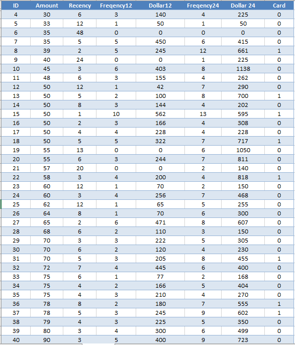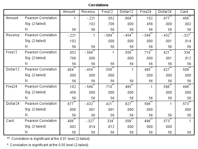 Freq24, Dollar24, chỉ có hệ số tương quan với Freq12, Dollar24 cao như đã nói, nên không xét nữa. Sau cùng là biến Card, biến này dường như vô hại vì hệ số tương quan với tất cả các biến còn lại đều rất thấp, nên cũng không cần quan tâm đến.