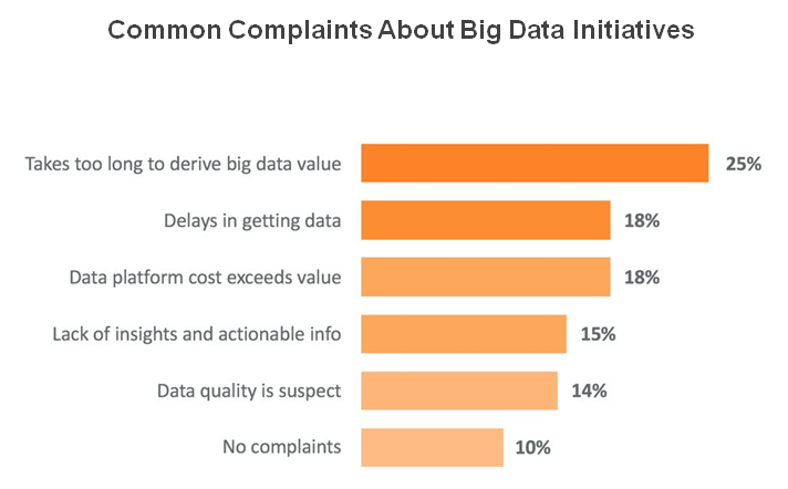 Các khiếu nại phổ biến nhất được trích dẫn bởi các giám đốc điều hành và các nhà đầu tư tập trung vào thời gian và chi phí cần thiết để có được giá trị kinh doanh thực sự từ các dự án Big Data. Điều này cho thấy sự cần thiết của các nền tảng, công cụ và công nghệ thông minh hơn, tiên tiến hơn để nâng cao năng suất hệ thống Big Data.