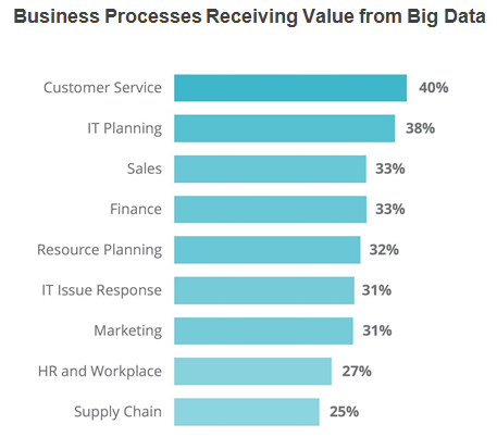 Chăm sóc khách hàng, kế hoạch CNTT, quy trình bán hàng và hoạt động tài chính là các quy trình kinh doanh thu lợi nhiều nhất từ Big Data. Các chức năng của Big Data ứng dụng cho hầu hết các bộ phận, phòng ban trong một tổ chức. Qua biểu đồ này chúng ta cũng nhìn thầy được mục đích khai thác Big Data của các công ty trên toàn cầu đều hướng đến chăm sóc khách hàng, phân tích dữ liệu khách hàng để phát triển sản phẩm, dịch vụ, ứng dụng thông minh tăng trải nghiệm của khách hàng, giữ chân khách hàng khi sự cạnh tranh ngày càng gay gắt giữa các công ty ở hầu hết các lĩnh vực kinh doanh. Sự thúc đẩy của việc vừa nâng cấp hạ tầng công nghệ thông tin vừa nhanh chóng áp dụng phân tích dữ liệu vào mọi hoạt động khiến cho các tổ chức hầu như việc làm đầu tiên (chưa tính đến các mục tiêu kinh doanh khác) phải thay đổi hệ thống IT sao cho tiên tiến.
