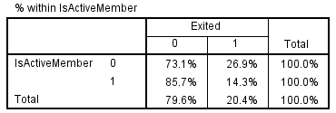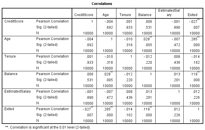 Bên trên là ma trận hệ số tương quan để đánh giá mối quan hệ giữa các biến định lượng với biến mục tiêu Exited. Các bạn nhìn nhanh vào cột sig là giá trị p-value kiểm định, thì thấy chỉ có biến Tenure và EstimatedSalary có sig > 0.05 với Exited, có thể chúng không có mối quan hệ với biến mục tiêu. Xét về vấn đề đa cộng tuyến thì chỉ có biến Age và biến Balance có mối quan hệ với nhau p – value = 0.005 < 0.01 như hệ số tương quan không quá cao, không tiến gần đến -1 hay 1, nên tác động có thể không lớn, nhưng chúng ta vẫn phải xem xét liệu có nên bỏ biến nào hay không dựa vào LR test. Các bạn có thể dựa trên case study 1 để tự đánh giá thử với mô hình full có đầy đủ các biến, và mô hình subset không chứa 1 trong 2 biến Age hay Balance, tương tự như Tenure và EstimatedSalary. LR test thì hiện tại các phần mềm thống kê hầu như đều hỗ trợ.
