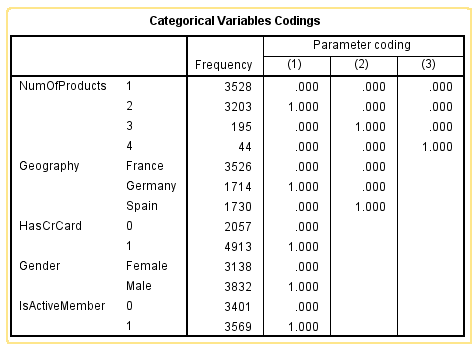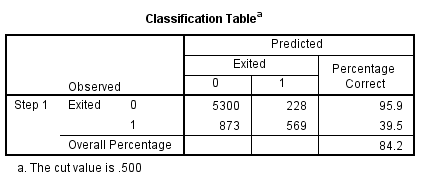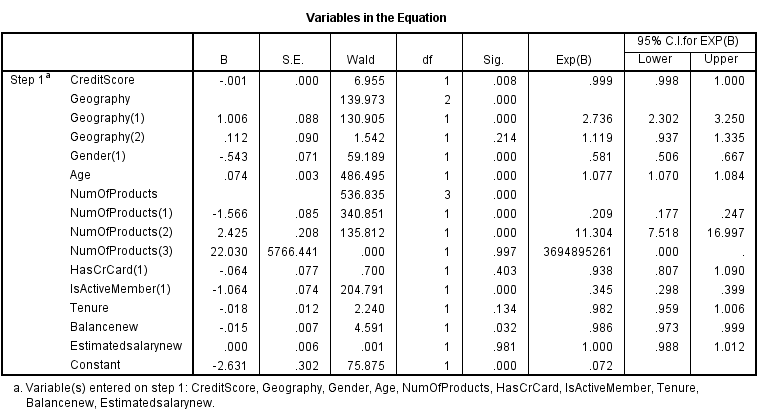 Bên trên là kết quả phương trình hồi quy logistic tổng quát. Chúng ta sẽ quan tâm phân tích đến các biến có sig value < 0.05 tức những biến dự báo này có ý nghĩa phân tích, khi chúng có mối quan hệ với biến mục tiêu. Lưu ý Balancenew, Estimatedsalarynew là biến chuyển đổi đơn vị tính xuống 1 đơn vị = 10000 Euro