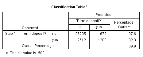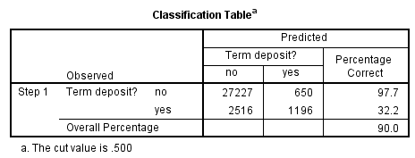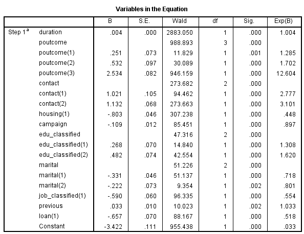 Như ở bài viết trước khi khám phá dữ liệu chúng ta thấy rằng học vấn đại học trở lên có khả năng đăng ký term deposit cao hơn, kết quả exp(β) cũng cho thấy điều tương tự. Lưu ý edu_classified (2) là biến dummy edu_tertiary, tức biến này cung cấp thông tin khách hàng nào có bằng đại học khách hàng nào không có.