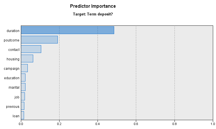 Giả sử chúng ta sẽ thử chọn 10 biến như trên để đưa vào mô hình. Ở các phần mềm phân tích khách Predictore importance có thể được tính bằng nhiều phương pháp khác nhau.