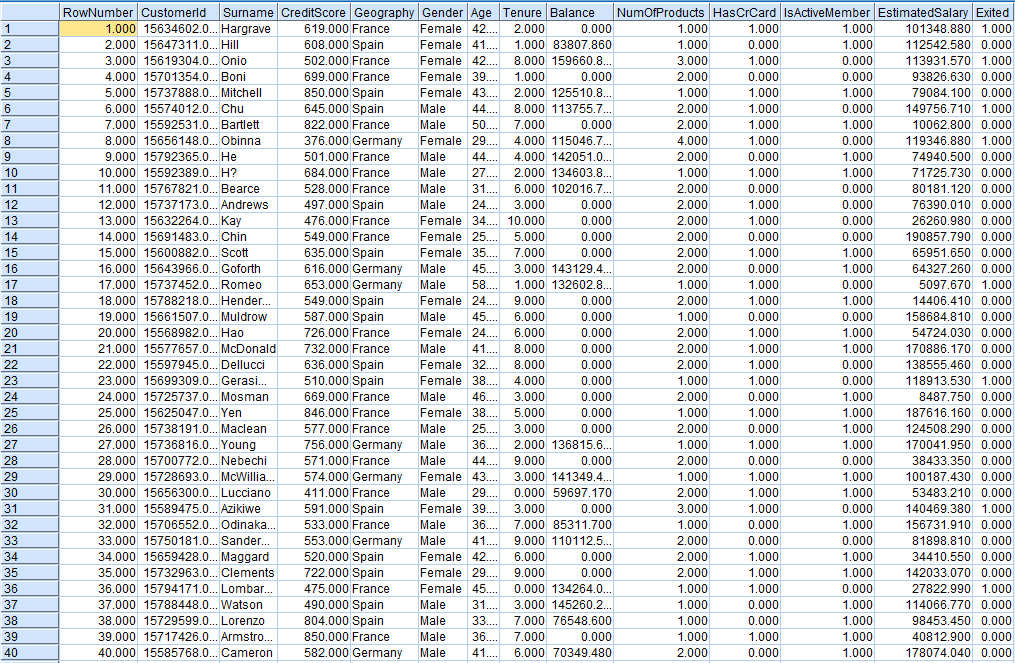 Tập dữ liệu gồm 10000 quan sát tương ứng với 10000 khách hàng. Dữ liệu cung cấp thông tin khách hàng nào còn sử dụng dịch vụ ngân hàng, và khách hàng nào không. Bao gồm 11 biến trong đó:
