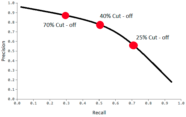 Precision và recall có sự đánh đổi phụ thuộc vào tỷ lệ cut – off mà chúng ta set cho mô hình