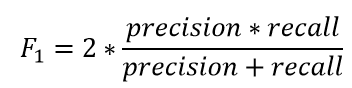 Một số nhà phân tích “tham lam” cho rằng họ muốn phát triển những mô hình phân lớp mà sao cho cả chỉ số precision và recall đều cùng được quan tâm và cải thiện, hạn chế sự đánh đổi của chúng. Lúc này họ sẽ sử dụng chỉ số F1 score. Chỉ số F1 điều hòa “harmonic” tầm quan trọng của cả Recall và Precision sao cho tương đương nhau. Công thức của chỉ số F1 bao gồm cả Precision và Recall: