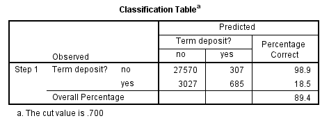 Lưu ý thêm nữa, các bạn cũng có thể dựa trên kết quả Wald test mô hình đầu để loại các biến dự báo không phù hợp cụ thể chúng có p-value tại cột sig > 0.005. Các biến age, default, month,… khi bị loại bỏ sẽ không ảnh hưởng đến mô hình, các bạn có thể thấy tại mô hình mới khi không có các biến này thì các chỉ số đánh giá đều được cải thiện hoặc ít có sự khác biệt với mô hình đầu.