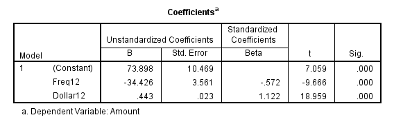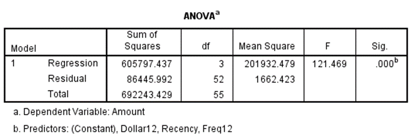 Chúng ta có giá trị kiểm định F = 121.469, các bạn có thể tra bảng phân phối F với bậc tự do thứ nhất là 3 và thứ 2 là 52 cùng α là 5%. Với giá trị F rất lớn và lớn hơn rất nhiều so với F tra bảng có giá trị khoảng 8.59, thì chứng tỏ một cách tổng thể là một trong các biến độc lập (recency, freq12, dollar12) đều có mối quan hệ với biến mục tiêu (amount). Các bạn đừng dựa vào giá trị p-value hay kiểm định F này cho rằng mô hình phù hợp để phân tích. Điều này hoàn toàn sai. Vì kiểm định F này chỉ cho biết biến mục tiêu có hay không có mối liên hệ với ít nhất một trong các biến độc lập x, nghĩa là nếu biến Amount có mối liên hệ ít nhất giữa một trong các biến Dollar12, Freq12, Recency, thì p-value sẽ nhỏ hơn 0.05. Như vậy nếu dựa vào đây, thì chúng ta sẽ bỏ sót biến Recency chưa tìm hiểu kỹ. Một điểm nữa cần lưu ý, p-value ở bảng trên cột (sig F change) hoàn toàn khác với giá trị p-value chúng ta vừa nói đến. Giá trị p-value tại Sig F change chính là giá trị kiểm đinh F trong công thức đầu tiên mà chúng tôi nói đến ở đầu bài viết.