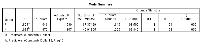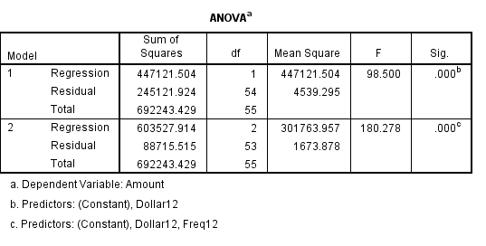 Sau khi đã xét hết các biến thì SPSS cho rằng phù hợp nhất cho mô hình sẽ là 2 biến Dollar12 và Freq12 – số lần khách hàng giao dịch trong 12 tháng. Mô hình thứ nhất với 1 biến Dollar12, (Constant là giá trị b0, nên chúng ta không tính là một biến, hãy nhớ lại phương trình hồi quy tổng quát trong bài viết trước) có giá trị kiểm đinh F rất lớn và lớn hơn giá trị F tra bảng với α = 0.05, tương tự như mô hình thứ 2 nên để đánh giá biến Freq12 khi thêm vào mô hình nó có ý nghĩa hay không chúng ta phải xem qua hệ số R2. Nhận thấy tại cột R-square, hệ số có tăng tự 0.639 đến 0.872, tương tự như hệ số R2 điều chỉnh nằm ở cột Adjusted R-square cũng tăng. Ngoài ra sai số dự báo của mô hình thứ 2 giảm mạnh so với mô hình thứ nhất. Qua đó chúng ta có thể khẳng định biến Freq12 thích hợp cho mô hình hồi quy. Lưu ý hệ số α để xét cho p-value là 0.05 khi p-value nhỏ hơn sẽ thêm biến vào mô hình, và là 0.1 khi p-value lớn hơn loại bỏ biến khỏi mô hình, mặc định trong SPSS, tuy nhiên các bạn vẫn có thể điều chỉnh. Với 2 giá trị kiểm định F quá lớn thì p-value chắc chắn sẽ nhỏ hơn 0.05, các bạn có thể biết được ngay nếu có kinh nghiệm kiểm định F thường xuyên. Giá trị tra bảng của F với alpha là 0.05 thường nhỏ dần khi bậc tự do phía cột bên trái, là số biến độc lập của mô hình tăng lên.