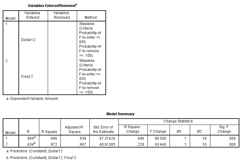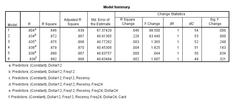 Nhìn vào kết quả chúng ta thấy được lý do tại sao chúng ta thấy được từ mô hình thứ 1 đến mô hình thứ 4, hệ số R2 và hệ số điều chỉnh R2 đều tăng, tuy nhiên tại mô hình 3 và 4, p-value (sig F change, giá trị kiểm định ở công thức đầu bài viết) lớn hơn 0.05, nghĩa là biến thêm vào mô hình thứ 2 (Recency) và biến thêm vào mô hình thứ 3 (Freq24) không phù hợp để đưa vào mô hình. Các bạn có thể thấy mô hình thứ 5, 6 cũng tương tự như vậy mà loại bảo. Mô hình thứ 1 và thứ 2 đều có p-value < 0.05, nhỏ hơn rất nhiều nên 2 mô hình này là phù hợp để phân tích, kết quả giống như Stepwise cung cấp.