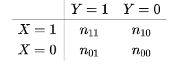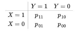 n11 là số quan sát mà tại đó đối tượng dữ liệu có đặc điểm X = 1, và Y = 1, xét tương tự có các n còn lại. Dễ hiểu hơn, lấy lại ví dụ trên, n11 là số khách hàng có thẻ thành viên có đăng ký ưu đãi. Lưu ý bảng được lập từ dữ liệu mẫu lịch sử, giá trị của biến mục tiêu không bị ẩn. Bảng này còn gọi là Contigency table. Nếu X là biến số tiền chi tiêu, và odds ratio tính trên biến này, thì X = 1 (là trường hợp x1 = 4 triệu) X = 0 (là trường hợp x1 = 3 triệu)