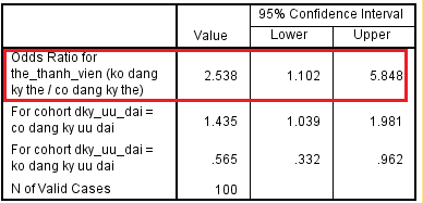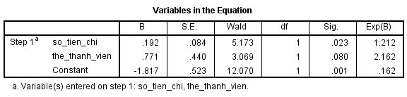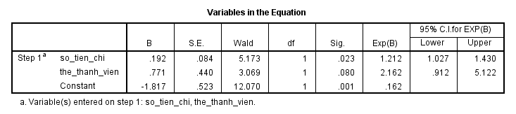 Các bạn nhìn vào cột Exp(B) chính là odds ratio tính bằng cách dùng hằng số nepe cho hệ số hồi quy, hay odds ratio tính được ở trên theo công thức thông thường. Ở cột cuối cùng có lower và upper, thì đây là khoảng tin cậy ước lượng cho odds ratio cần tìm. Xét thử cho biến thẻ thành viên.